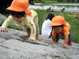 散歩(園外保育)を保育の中心に位置づけています。変化に富んだ自然に多く触れ、豊かな心を育てます。 |